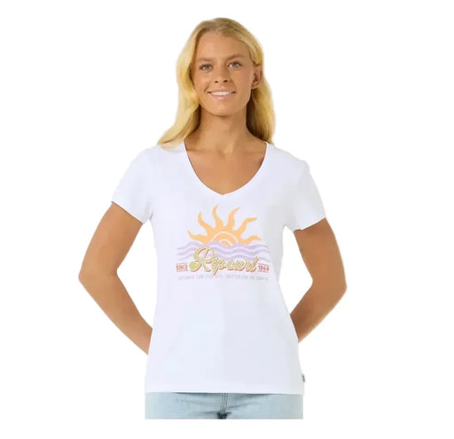 Rip Curl Cala V Neck Tee in colour White The Cala is a casual and comfortable Rip Curl V neck tee for women. It features a stylish sun-inspired gra...