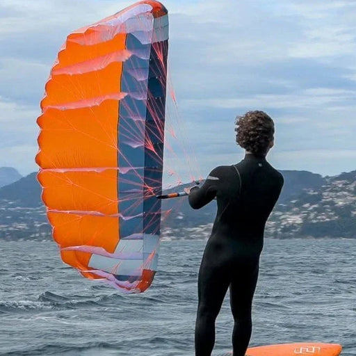 Most first-time wing foilers will learn on around a 5m wing and once you have learnt you may buy more wings for either strong or light winds, size now ranges from 2.5m up to 8m wings for very light winds.
